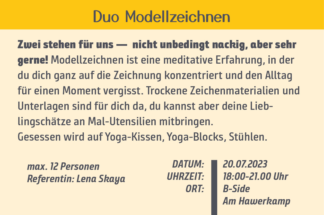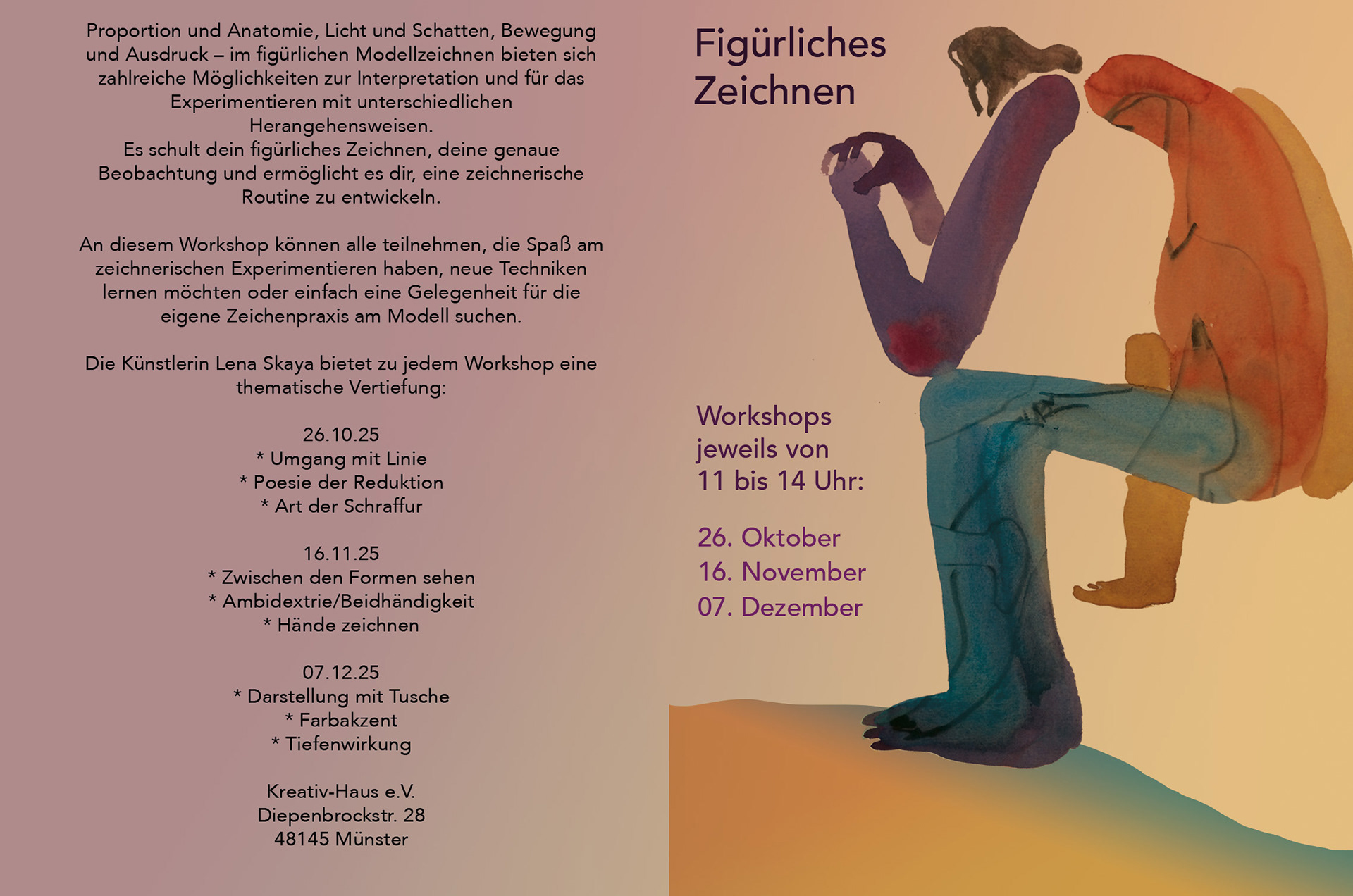 Lena Skaya lädt Sie ein, Charakter, Proportionen und Haltung, Hände, Füße und Gesicht Ihres Gegenübers skizzierend zu erforschen. Mit einfachen Übungen und kreativen Lockerungen garantiert sie Erfolgserlebnisse und entfacht die Freude an der Figuration. Sie erschließt Ihnen eine Vielfalt an Kreativtechniken und ebnet den Weg zum eigenen künstlerischen Ausdruck.
